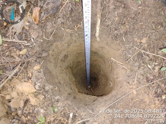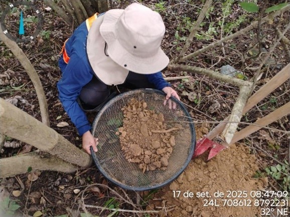 Foram aplicadas metodologias de prospecção arqueológica, incluindo reconhecimento de superfície e abertura de poços-teste.